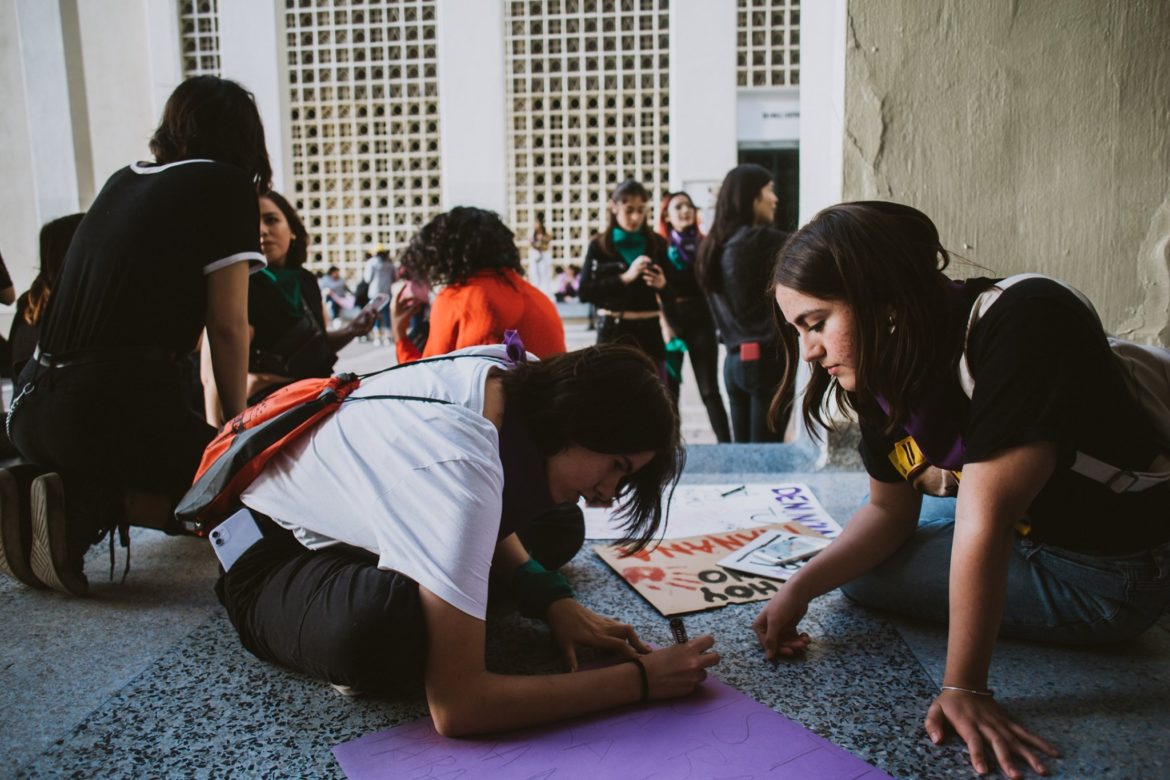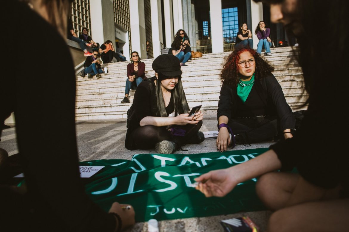 Grupo de mujeres en una protesta, algunas con carteles, una tomando una foto y otra revisando su teléfono.