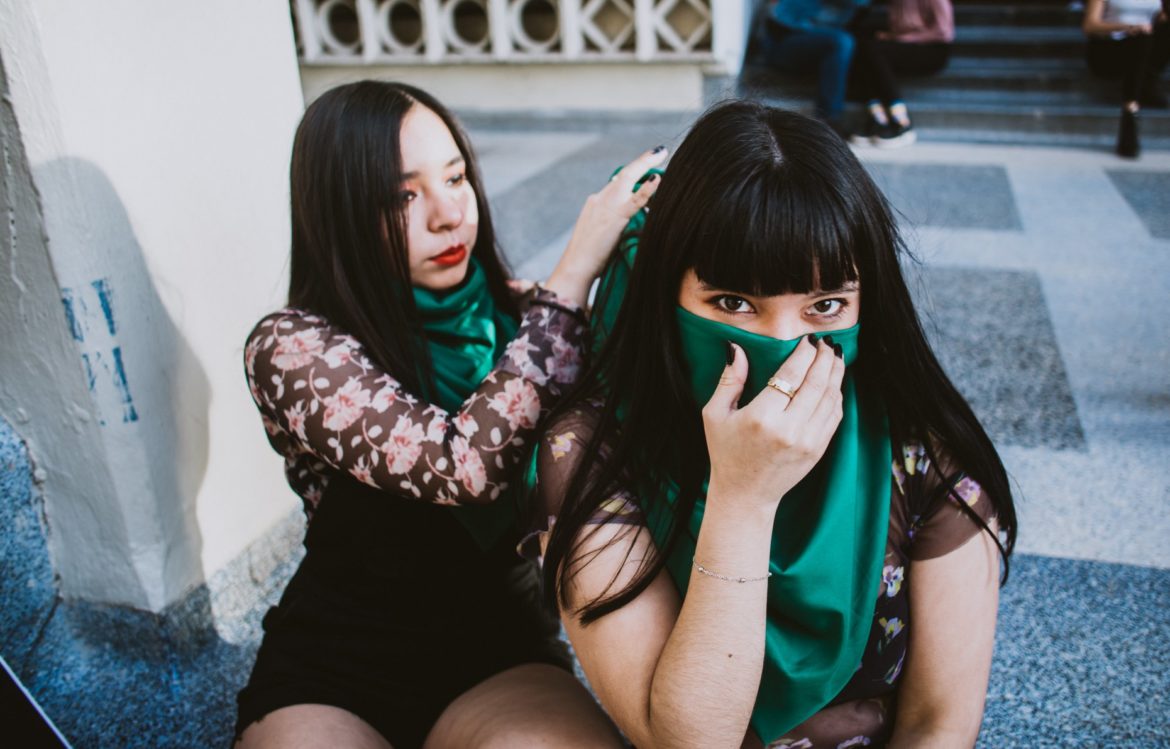 Dos mujeres se toman de la mano en una protesta y caminan entre la multitud junto con otras que llevan pañuelos verdes.